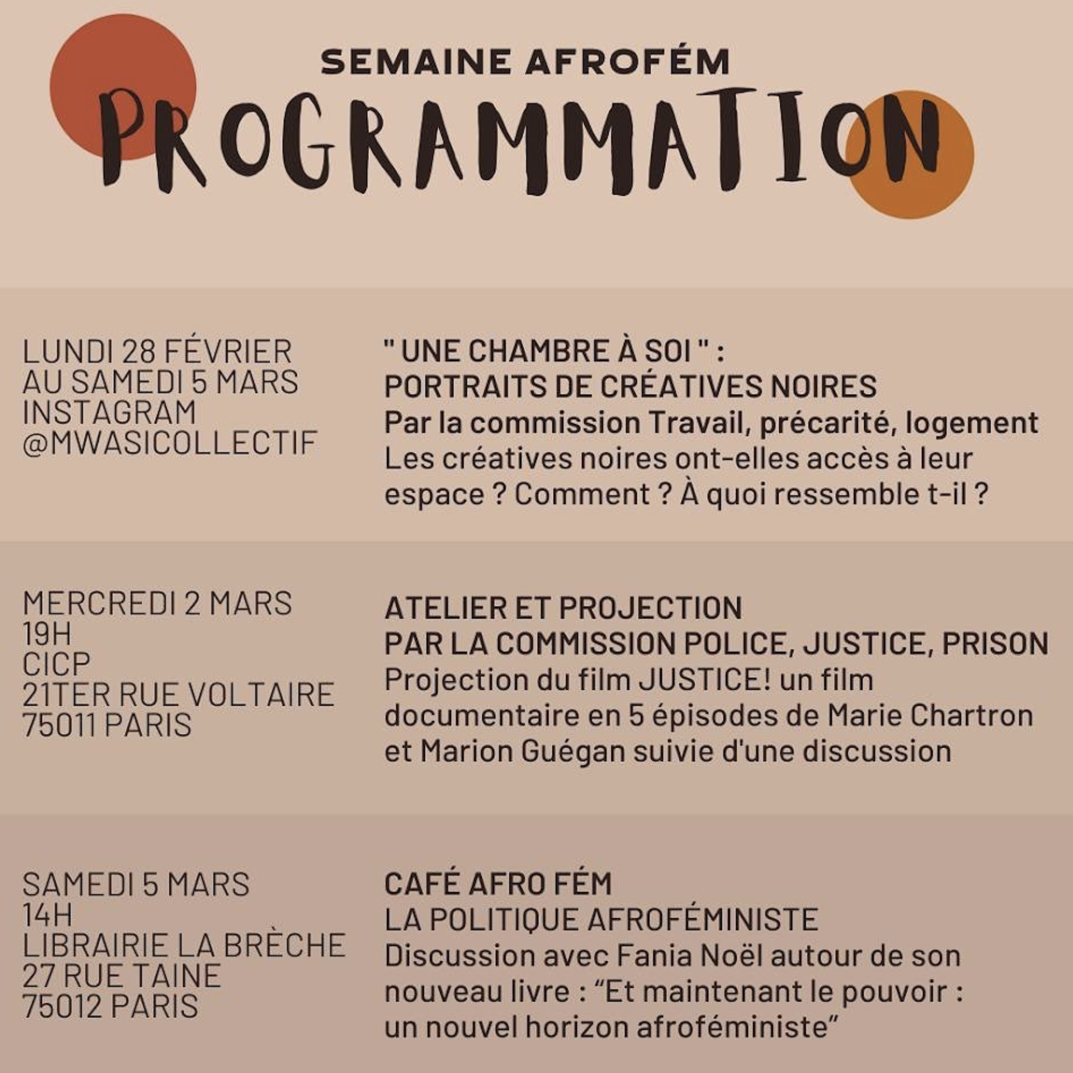 Depuis plusieurs années, Mwasi propose durant le mois de mars une semaine d'événements, de rencontres autour des féminismes noirs en France. Cette semaine, qui se tient traditionnellement avant le 8 mars, s'est tenue en 2025 durant la dernière semaine du mois. Nous avons été obligées de décaler la semaine, pour des raisons logistiques.
