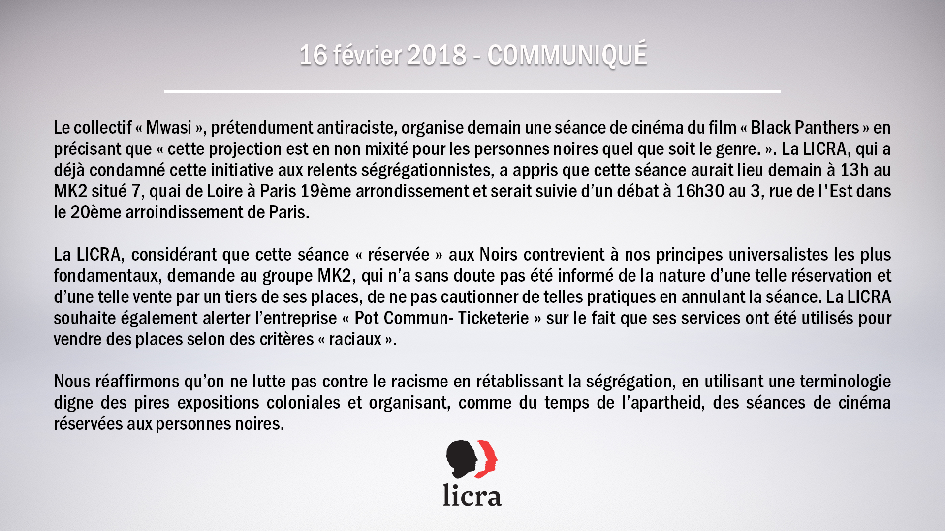 Très vite, la LICRA s’en est prise à nous sur les réseaux sociaux et a annoncé qu’un tel affichage de “communautarisme” et de “racisme anti-blancs” ne serait pas toléré : l’organisation a ainsi donné le coup d’envoi de torrents de harcèlement à notre encontre. Ainsi, quand nous avons contacté le MK2 Quai de Loire pour réserver 95 places de cinéma pour une de leurs séances, ceux-ci nous ont fièrement rétorqué qu’alertés par la LICRA de nos projets “communautaristes”, ils refusaient de nous vendre des tickets.